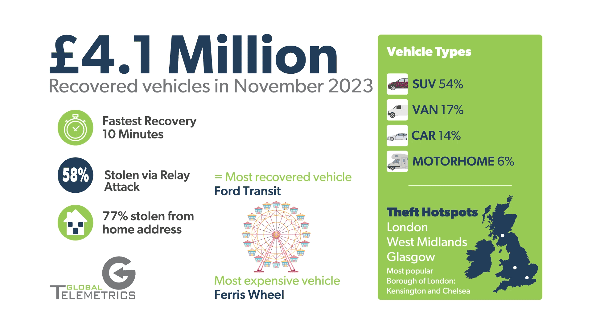 During November 2023, Global Telemetrics were responsible for the recovery of £4.1m vehicles. This takes the year’s total to £36.1 million so far, which is just £700k short of surpassing 2022’s final total, which during December has now been surpassed. November 2023, sees a continuation of a high valuation of vehicles recovered in November as 2022 also saw a recovery total above £4m.