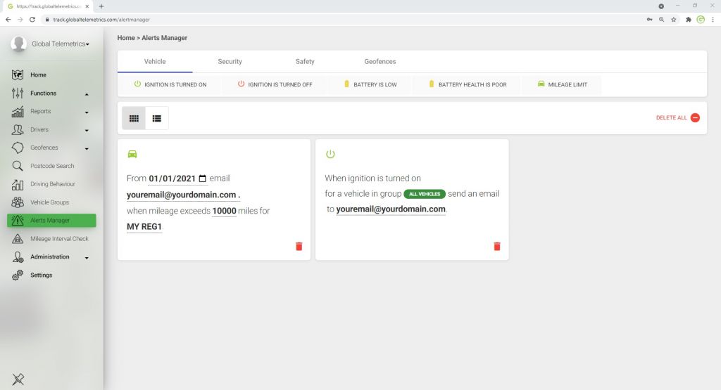 Setup to receive emails about requested information regarding your vehicle(s). Be alerted every time the vehicle’s ignition is switched on if the vehicle travels over a certain speed.