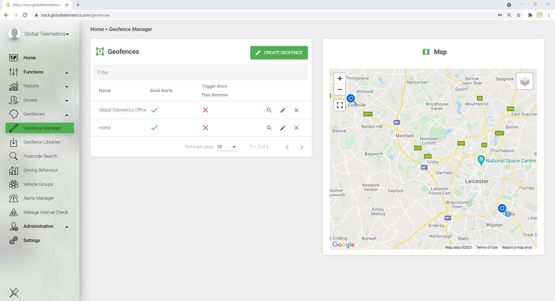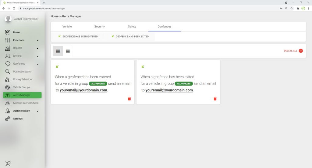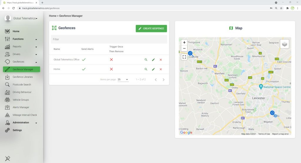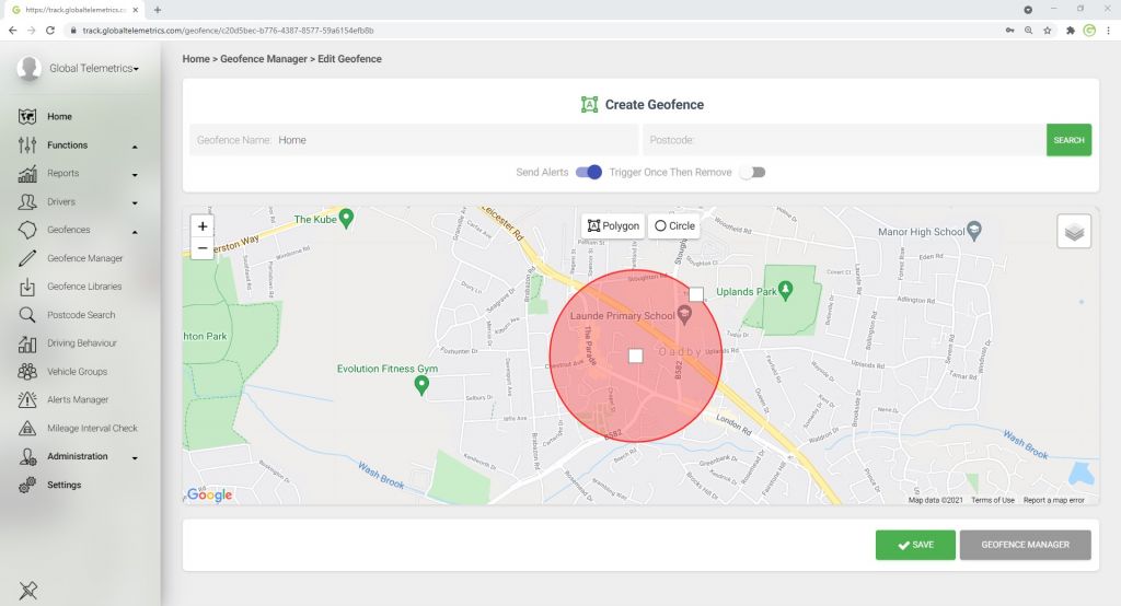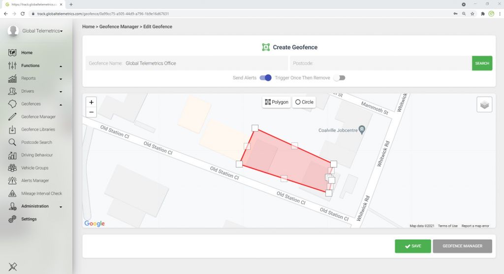 A geofence is a virtual perimeter around a selectable location; an email will be sent if your vehicle enters or exits the requested area. An example of this is around a port which would then alert you to state that the vehicle was within the area and maybe going abroad.
