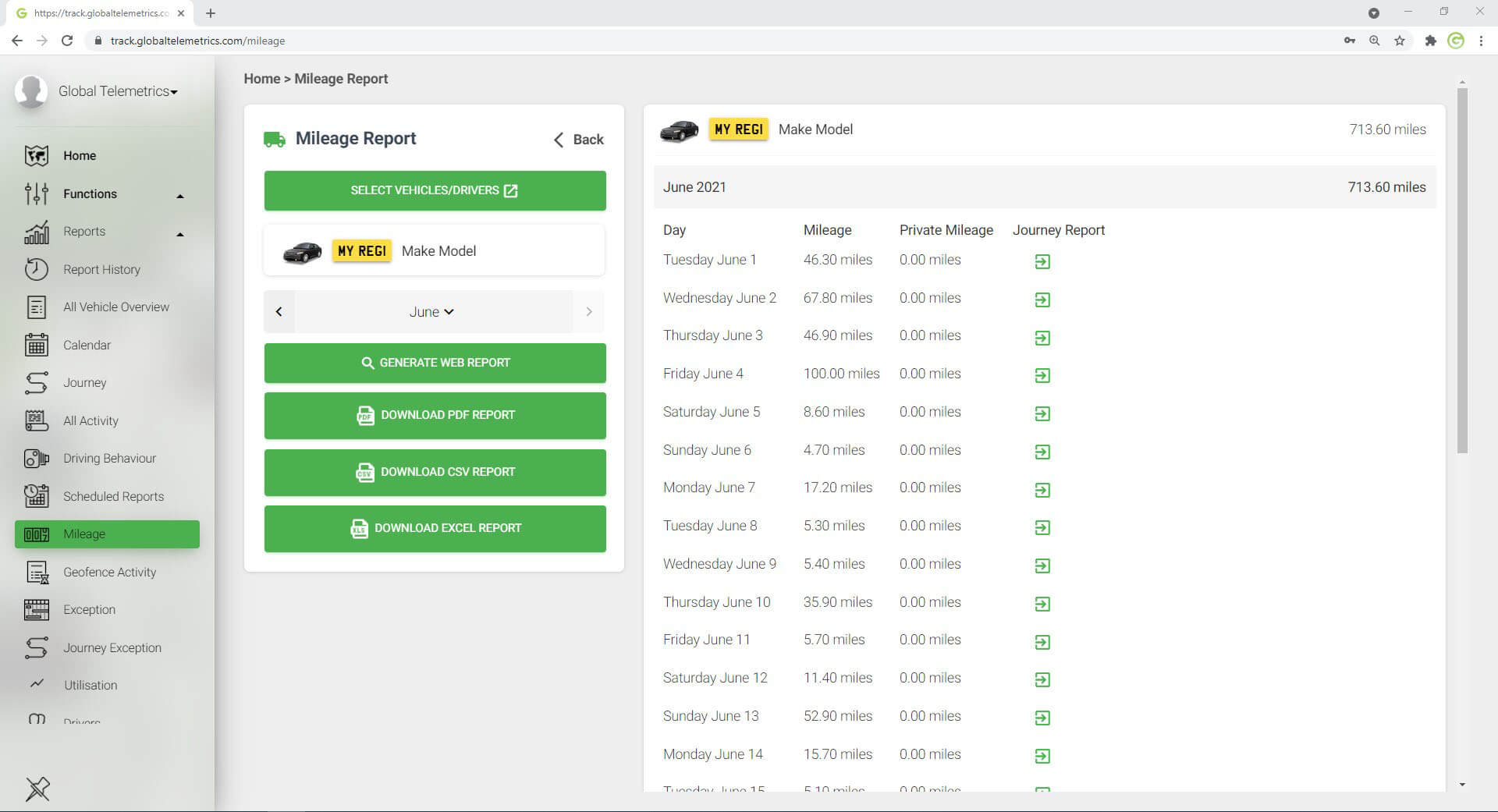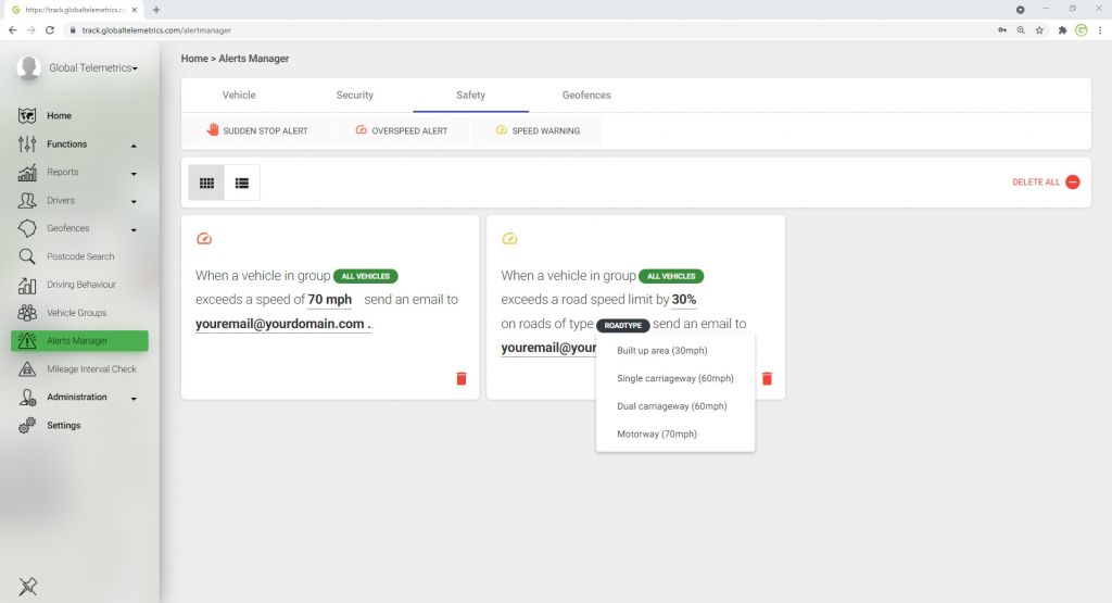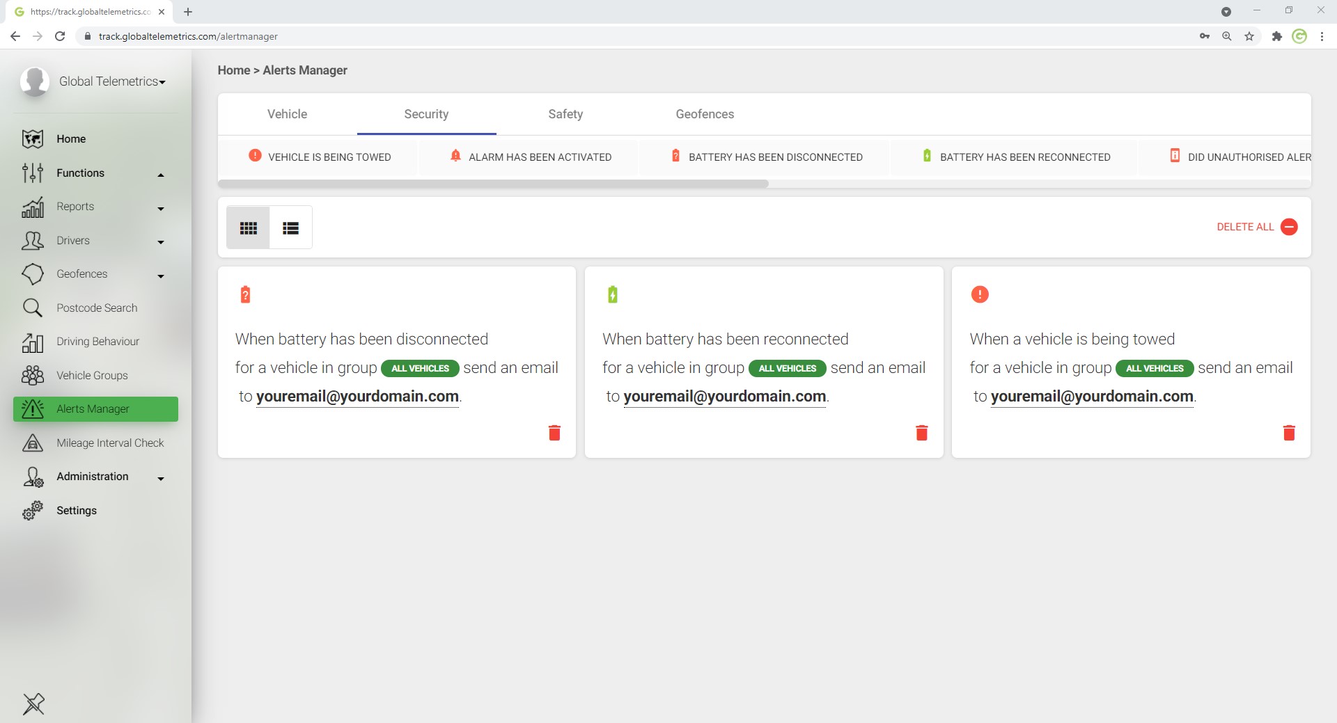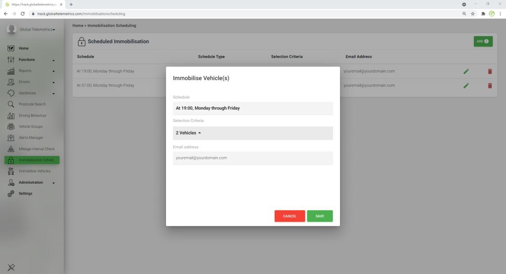 A geofence is a virtual perimeter around a selectable location; an email will be sent if your vehicle enters or exits the requested area. An example of this is around a port which would then alert you to state that the vehicle was within the area and maybe going abroad.