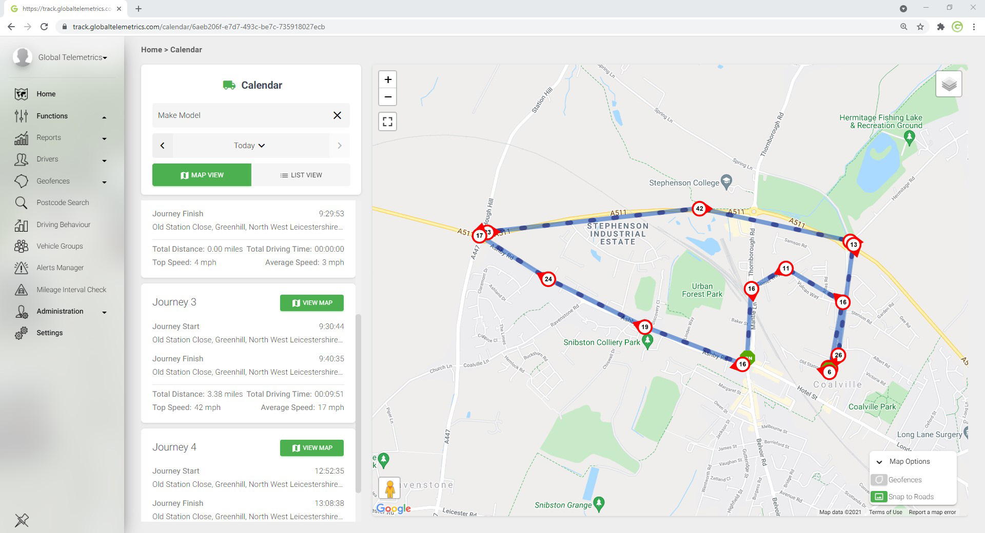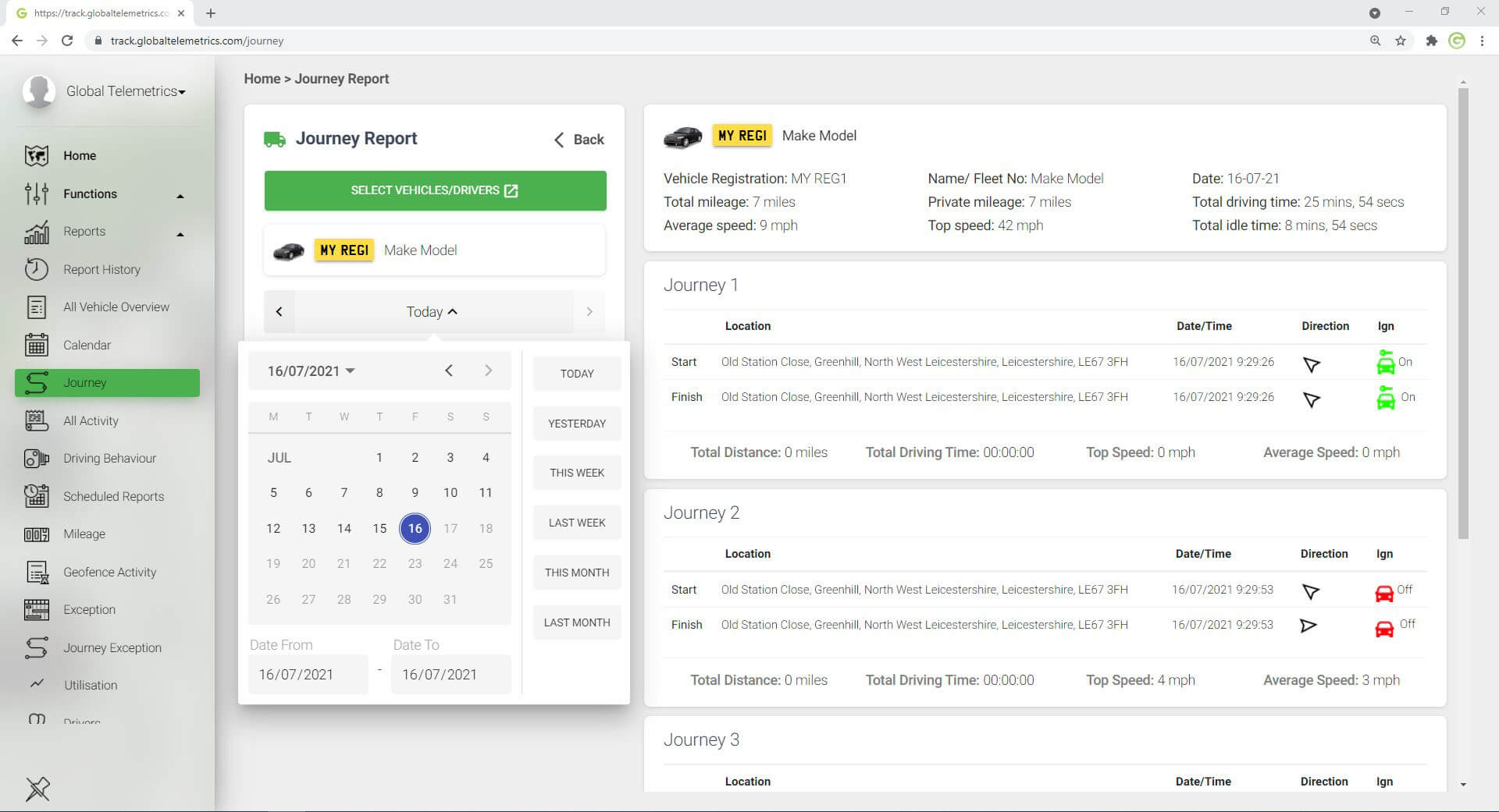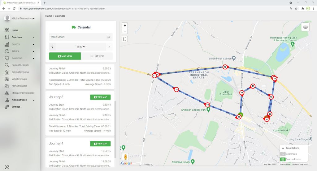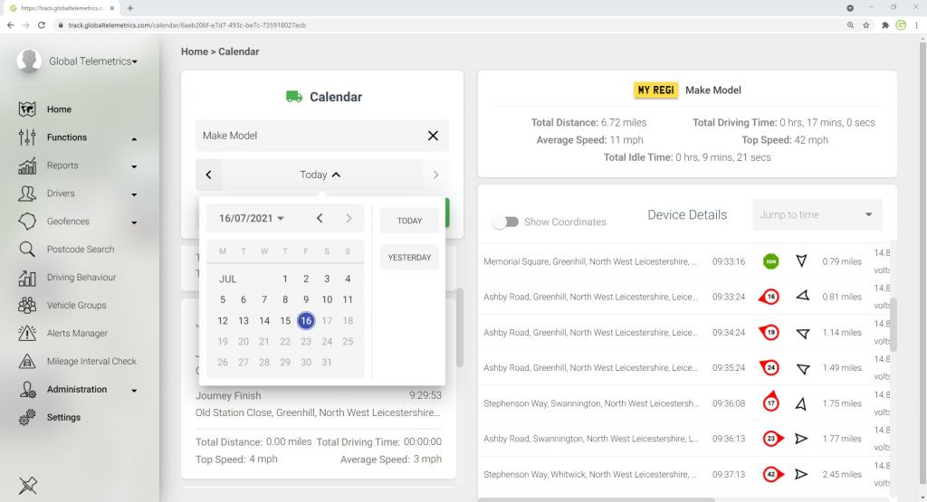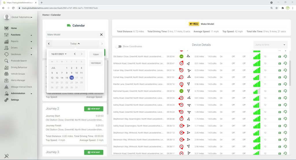 The calendar option is an easy way to view current and historical information from the tracking system. Information can be broken down into options, by list or by mapping screen. The information displayed shows location, speed and battery voltage.