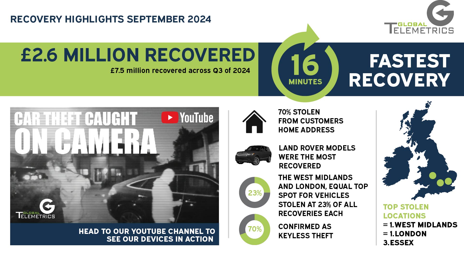 Global Telemetrics are proud to announce that since inception in 2006 we have now recovered over £180m worth of vehicles for our customers with £26.6m for 2024 alone.